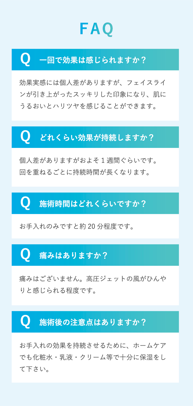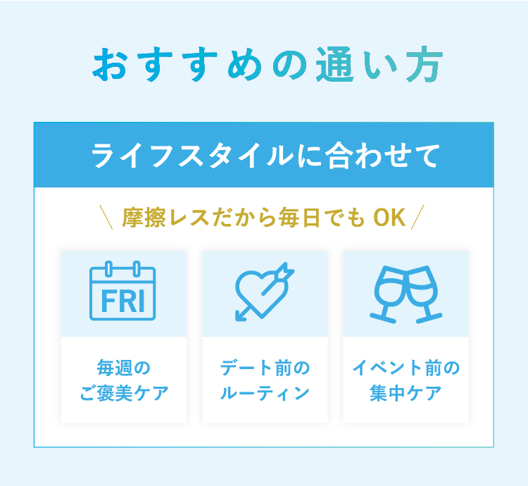 以下に該当する方はお受けいただけません。 ・妊娠中および授乳中の方 ・医療機関を利用されている方(医師確認が取れている場合はお手入れ可能) ・てんかん、光感受性の高い方 ・白斑のある方 ・ケロイド体質の方 ・本トリートメント施術後、日焼けの予定がある方 ※以下に該当する部位はお受けいただけません。 ・ピーリング施術をした部位 ・皮膚トラブルのある部位 ・薬品を使用している部位(湿布の使用前後も含む) ・日焼けした肌
